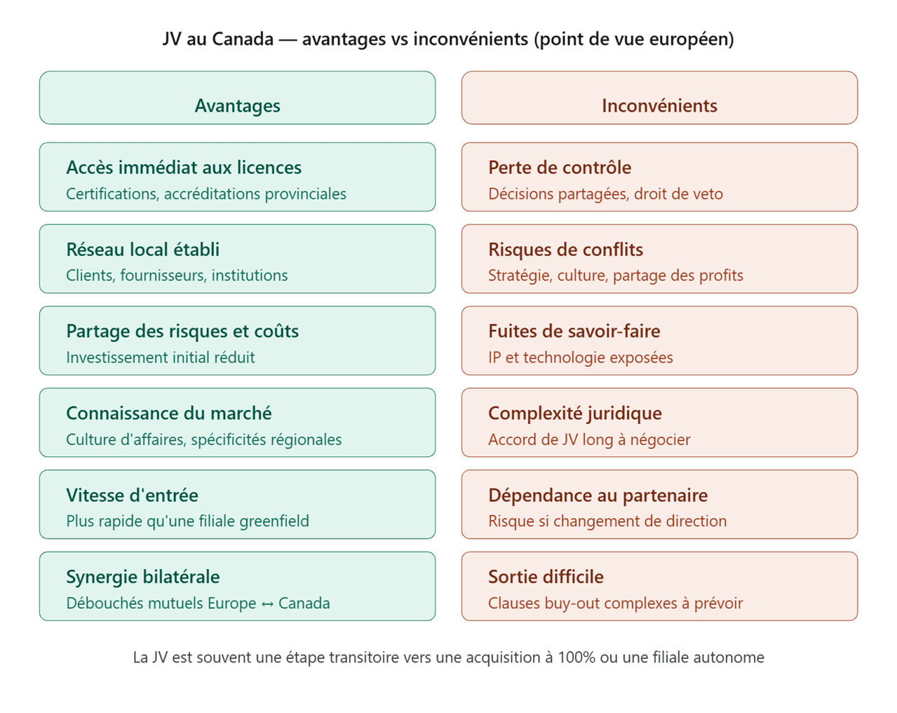La JV est souvent la formule la plus pragmatique pour une entrée européenne au Canada, surtout quand les licences ou accréditations manquent, que le marché est méconnu, ou que la vitesse d'exécution est une priorité. Elle fonctionne d'autant mieux quand les deux partenaires ont des forces complémentaires et une logique d'échange bilatéral — l'un amène le marché canadien, l'autre ouvre les portes de l'Europe. La JV peut aussi être pensée dès le départ comme une étape transitoire, avec une option d'acquisition à 100% une fois le marché validé et la relation de confiance établie.