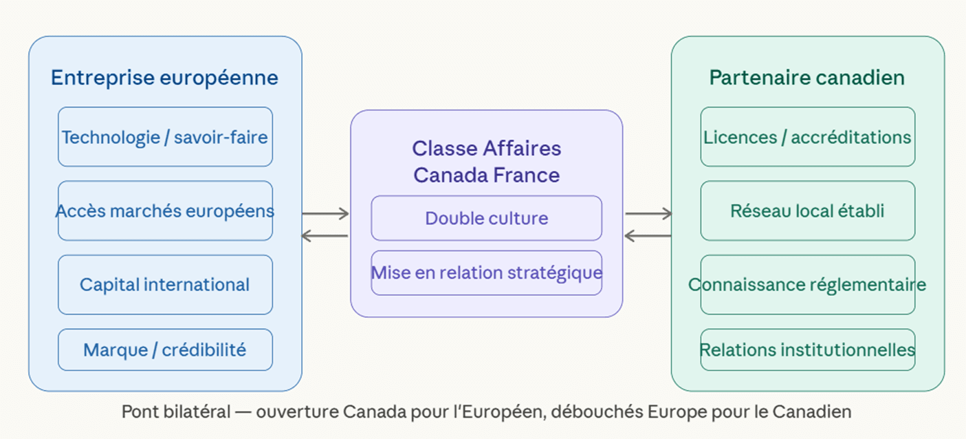 Enfin, et c'est peut-être l'aspect le plus stratégique, Classe Affaires opère dans les deux sens. Pour un acquéreur européen cherchant à entrer au Canada via une JV, elle représente un accélérateur d'entrée. Mais pour les entreprises canadiennes qui cherchent elles-mêmes un partenaire européen pour ouvrir de nouveaux débouchés, elle constitue un canal privilégié. Cette position de carrefour bilatéral fait de Classe Affaires Canada France non pas un simple intermédiaire, mais un acteur de mise en relation stratégique — exactement le type de structure qui manque le plus aux entreprises en phase d'internationalisation.