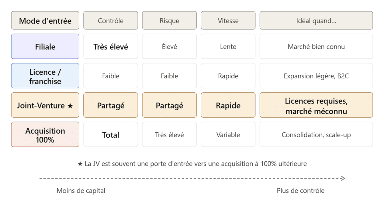Chaque mode d'entrée répond à un profil de risque et d'ambition différent. La JV se positionne généralement comme l'option intermédiaire optimale lorsqu'on manque d'accréditations locales ou que l'on veut valider le marché avant d'investir davantage.